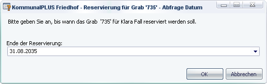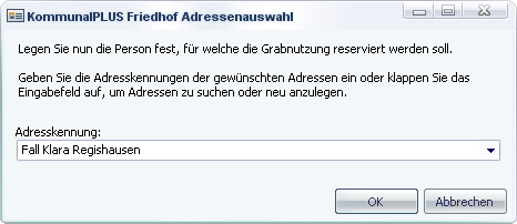 Öffnet ein Dialogfenster, in dem die Adresse der Person eingegeben werden kann, für welche die Grabnutzung reserviert werden soll. Nach erfolgter Adressangabe und -bestätigung wird das Datum abgefragt, zu dem die Reservierung endet. Im weiteren Ablauf des Arbeitsschritts wird der Reservierungsvermerk bestätigt und es besteht die Möglichkeit, eine Rechnung zu erstellen.