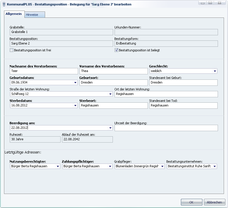 Nach erfolgter Auswahl öffnet sich ein weiteres Dialogfenster, in dem Detailangaben zur Bestattung erfasst werden können.Besteht für das Grab eine Reservierung, so muss diese zunächst über den Arbeitsschritt Reservierung aufheben aufgehoben werden.