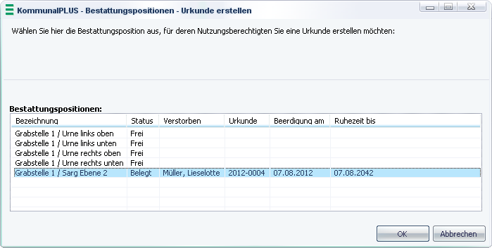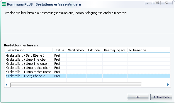 Öffnet zunächst ein Dialogfenster, das die möglichen Bestattungspositionen des Grabs und Angaben zu deren aktueller Belegung zur Auswahl auflistet.