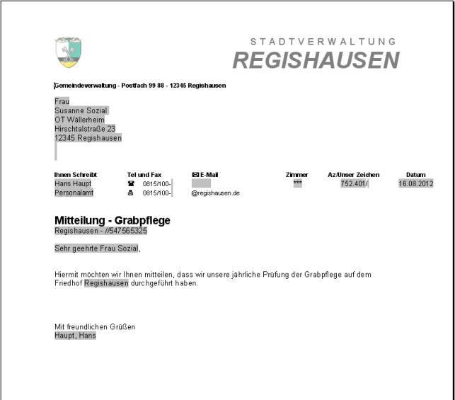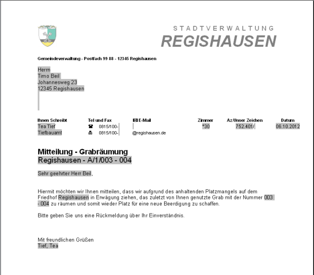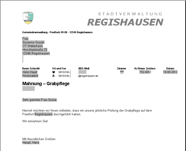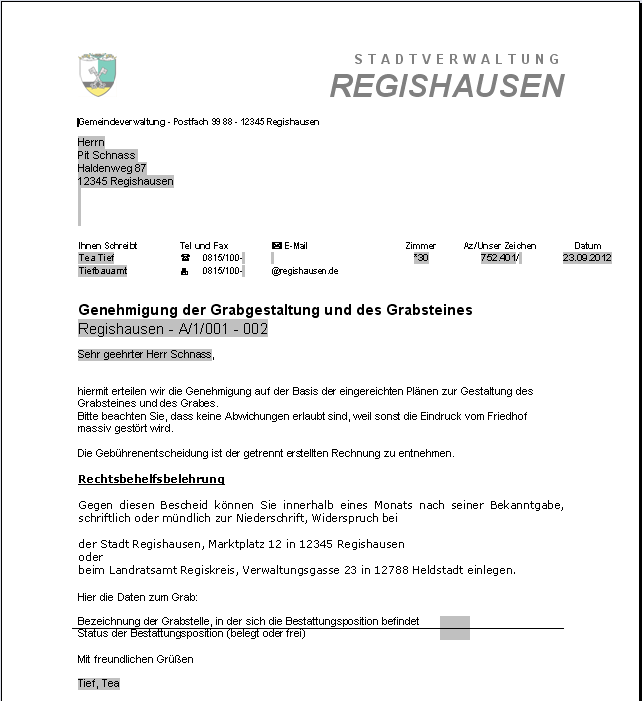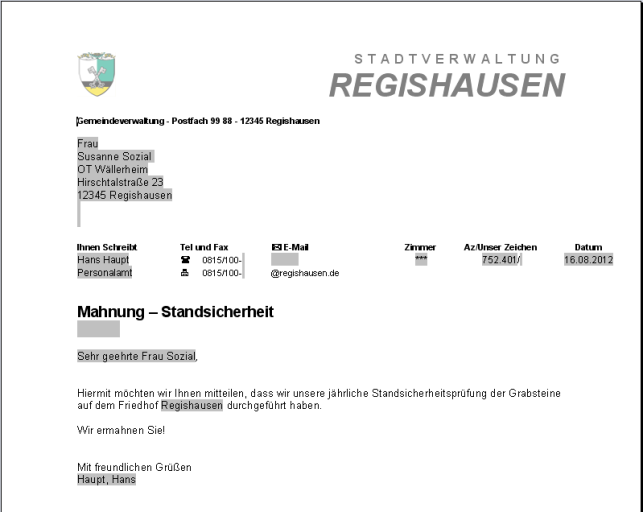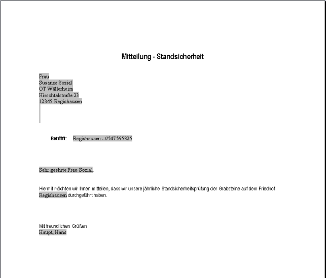 Vorlage mit der Kennung: KP_FH_MITSS - Grabstein | Mahnung zur Instandsetzung erstellen