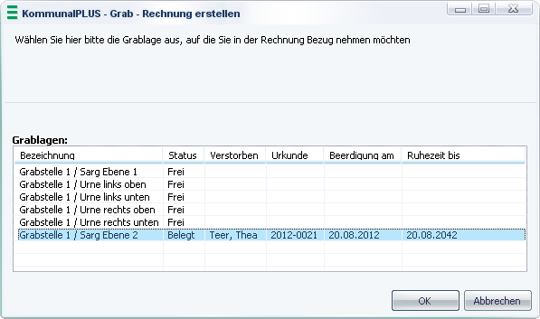 Öffnet das Dialogfenster, das alle Bestattungspositionen des Grabs listet. Soll in der Rechnung auf eine bestimmte Bestattungsposition Bezug genommen werden, kann diese hier ausgewählt werden. Danach öffnet sich das Dialogfenster zur Rechnungserstellung.
