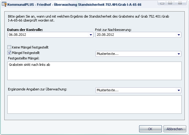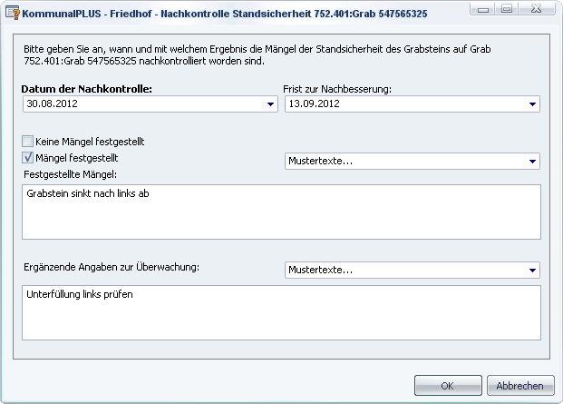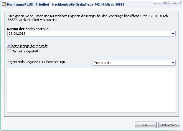 Öffnet ein Dialogfenster zur Erfassung des Datums, an dem die Grabpflege nachkontrolliert wurde, und des Ergebnisses dieser Nachkontrolle. Wurden Mängel festgestellt, können zusätzlich eine Frist zur Nachbesserung sowie Details über die Beanstandung eingetragen werden. Außerdem kann ein Mahnschreiben an den Nutzungsberechtigten über die fehlende Behebung der Mängel, welche die Nachprüfung der Grabpflege ergab, erstellt werden.