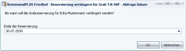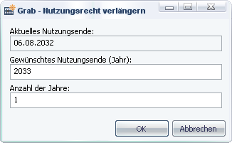 Öffnet ein Dialogfenster zur Eingabe des Jahres, bis zu dem die Nutzung verlängert werden soll, und ruft anschließend die Rechnungserstellung auf. Beim Aufruf dieses Arbeitsschritts wird zunächst geprüft, ob entsprechend dem Eintrag in der Grabakte eine Verlängerung zulässig ist.