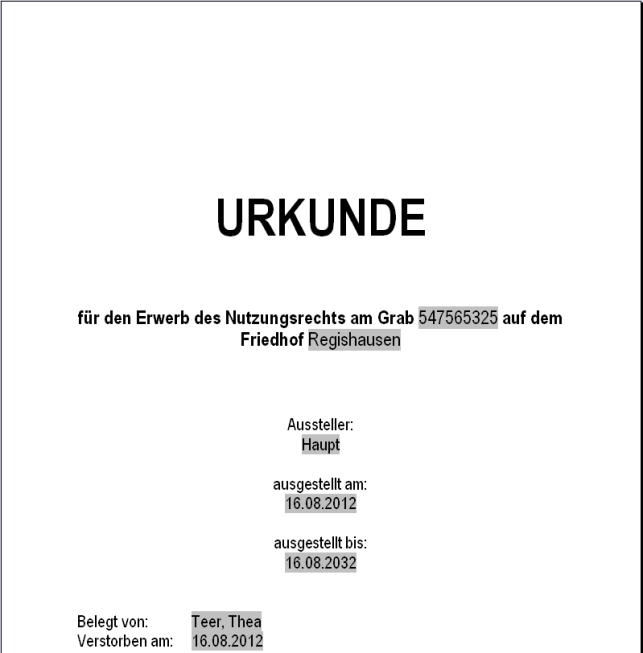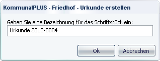 Öffnet nacheinander zwei Dialogfenster zur Abfrage der Bestattungsposition und der Dokumentbezeichnung und erstellt anschließend eine Urkunde mit den entsprechenden Angaben.