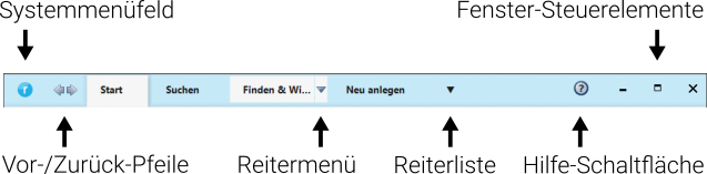 Rechts neben den Programmreitern befindet sich ein Pfeilsymbol ▼, das eine Liste aller aktiven Reiter und Fenster öffnet, die sogenannte Reiterliste. Über diese Liste kann direkt in ein aktives Fenster oder einen aktiven Reiter gewechselt werden. Ist im Reiter Finden & Wissen mehr als eine Trefferliste geöffnet, so werden diese als Untereinträge zum Eintrag Finden & Wissen angeboten.
