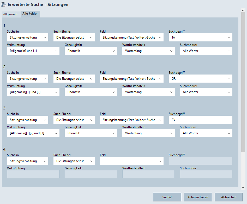 Erweiterte Suche - Sitzungen - Reiter "Alle Felder"