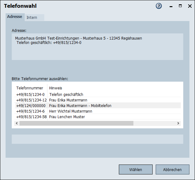 Zu diesem Zweck muss lediglich eine in regisafe gespeicherte Adresse ausgewählt und der Befehl Telefonwahl ausgeführt werden. Daraufhin öffnet sich das Dialogfenster Telefonwahl, in dem eine Telefonnummer ausgewählt (falls mehrere zur Auswahl stehen) und das Gespräch gestartet werden kann.
