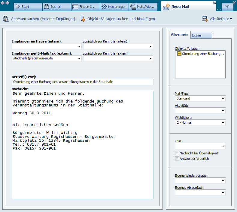Das in regisafe gespeicherte Dokument mit der Buchung eines Veranstaltungsraums wird zur Stornierung als neue E-Mail verschickt.