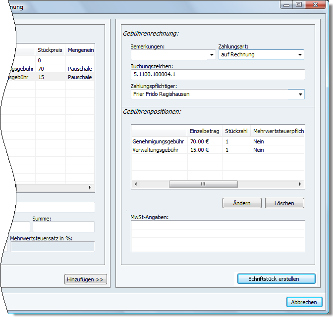 Das Dialogfenster Rechnung ermöglicht die Abrechnung von Gebühren auf Basis der vorgegebenen Gebührentatbestände.