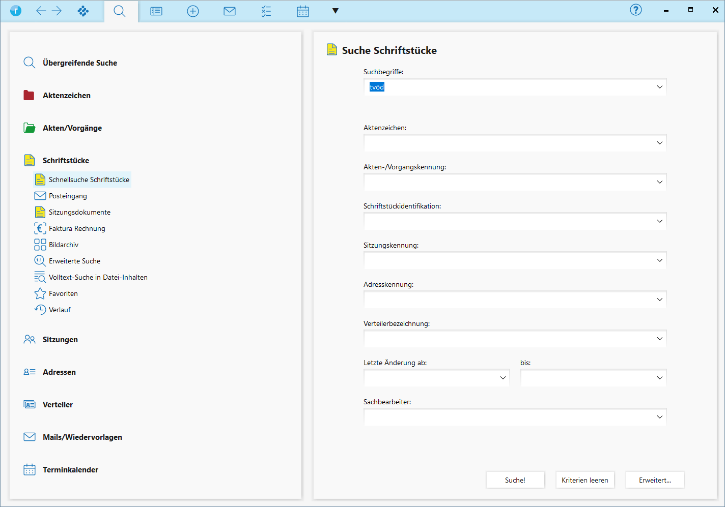 Aktenzeichen). - In der Suchmaske auf der rechten Seite werden dadurch zusätzliche Felder angezeigt.