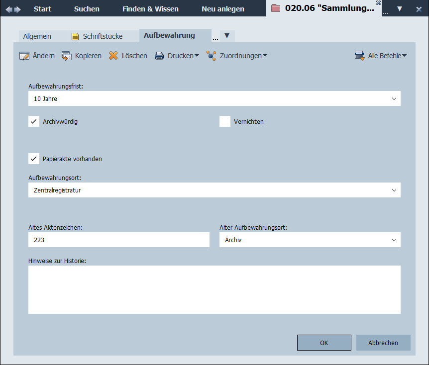Aktenzeichen bearbeiten - Reiter "Aufbewahrung"