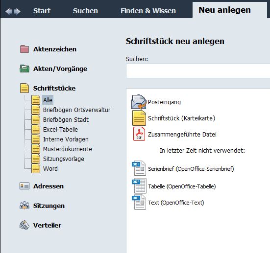 Schriftstücke z.B. den Eintrag Alle Schriftstück-Arten | OpenOffice/LibreOffice-Text oder. ... | OpenOffice/LibreOffice-Serienbrief wählen und anschließend die gewünschte Vorlage doppelklicken.- Sie gelangen ebenfalls in den Programmreiter Neu anlegen, wenn Sie im Programmreiter Finden & Wissen im Kontextmenü eines Objektes in der Trefferliste den Befehl