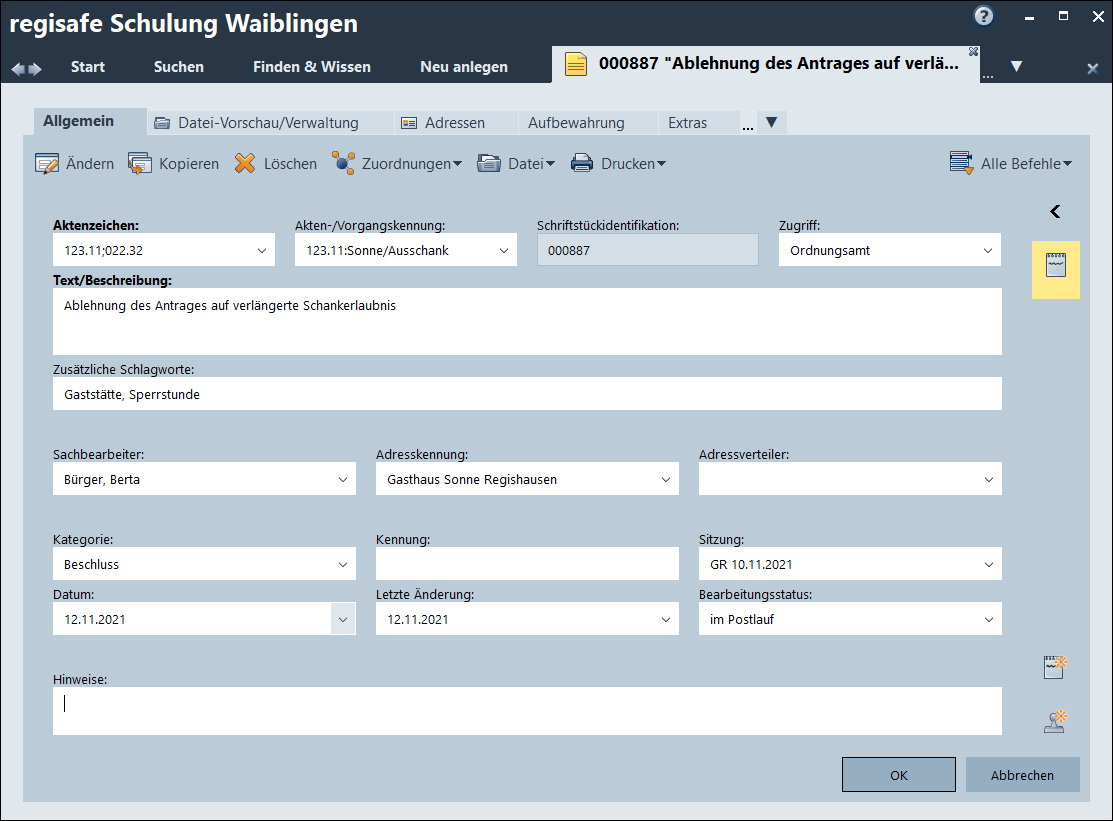 Schriftstück-Datensatz bearbeiten - Reiter "Allgemein"