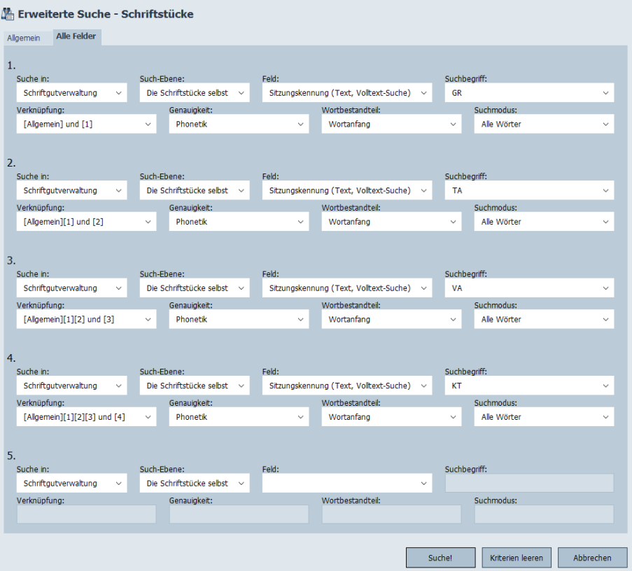 Erweiterte Suche - Schriftstücke - Reiter "Alle Felder"