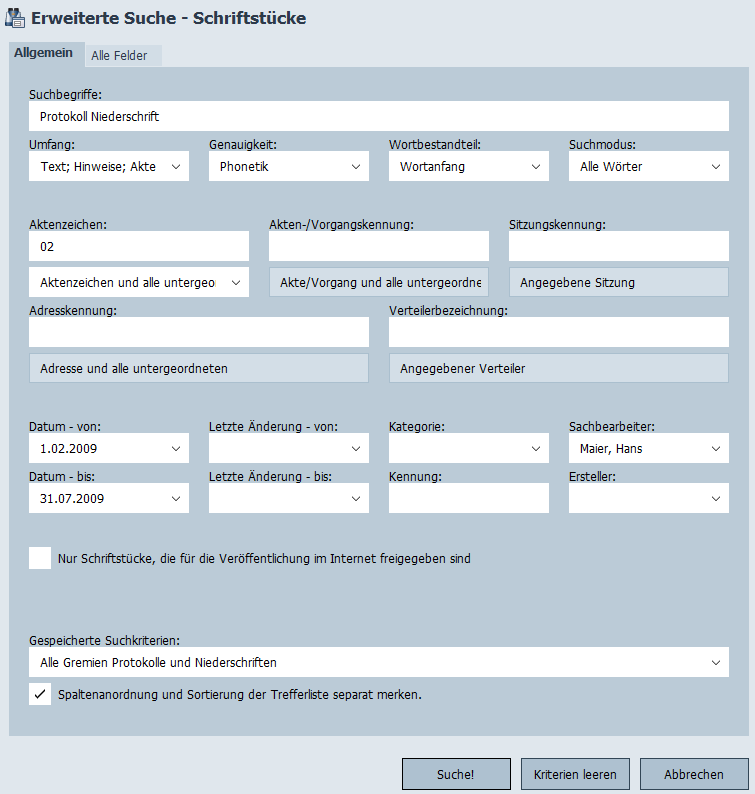Erweiterte Suche - Schriftstücke - Reiter "Allgemein"