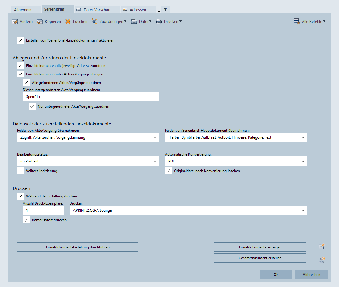 Einzeldokumente aus Serienbriefen mit Datenquelle werden stets in der Akte angelegt, der auch der Serienbrief selbst zugeordnet ist.