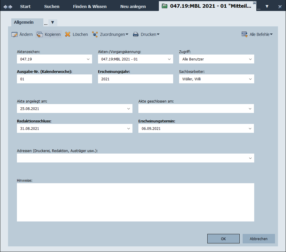 Ändern. - Doppelklicken Sie auf eine bestehende Akte in einer Trefferliste und klicken Sie ggf. anschließend auf die Schaltfläche Ändern.
