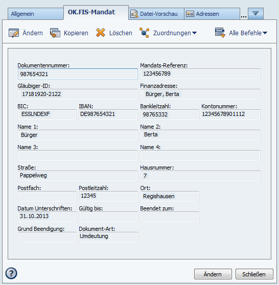 Die einzelnen Felder werden automatisch von OK.FIS-Mandat übernommen. Informationen über Bedeutung und Inhalt der einzelnen Felder erhalten Sie daher von der AKDB. Eine Aufstellung der Übergabefelder aus OK.FIS-Mandat enthält die Administratoren-Dokumentation.