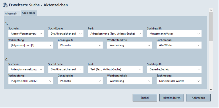 Erweiterte Suche - Aktenzeichen - Reiter "Alle Felder"