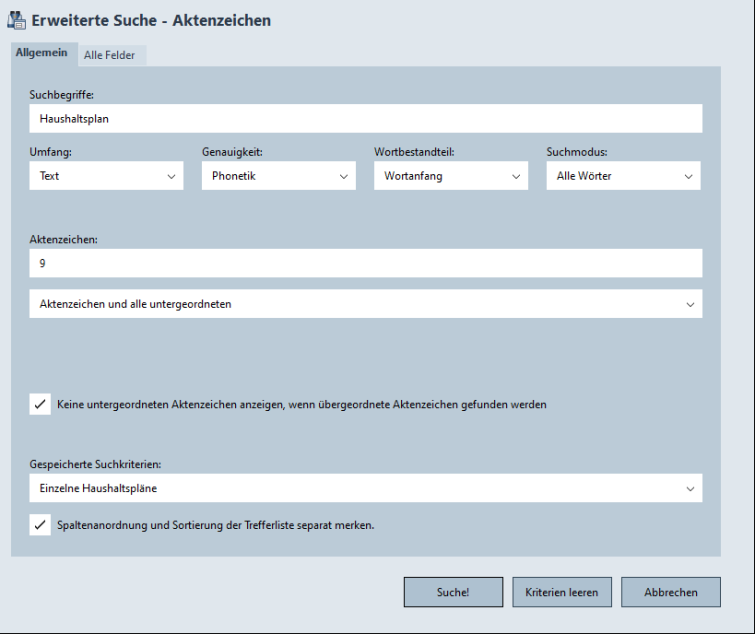 Beachten Sie, dass jede Suche alle Einträge in den Reitern Allgemein und Alle Felder berücksichtigt!