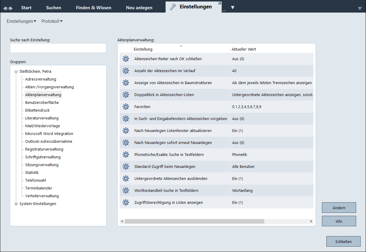 Einstellungen geöffnet ist.- Im Bereich Gruppen werden, je nach Berechtigung, die einzelnen Gruppen der System-Einstellungen und der Benutzer-Einstellungen (unter dem eigenen Namen) angezeigt.