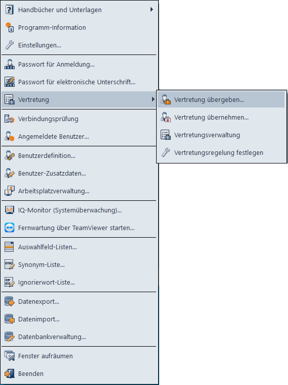 Dieser Befehl öffnet das Vertretungs-Untermenü mit allen Befehlen zur Bearbeitung von Vertretungen. Das Untermenü steht nur zur Verfügung, wenn das Anwendungsmodul Vertretungsregelung eingesetzt wird. Mehr dazu: Vertretungen verwenden |