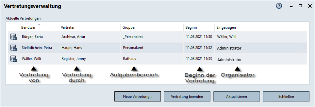 - Die ausgewählte Vertretung wird im Dialogfenster Vertretungsverwaltung ergänzt und gleichzeitig aktiviert.