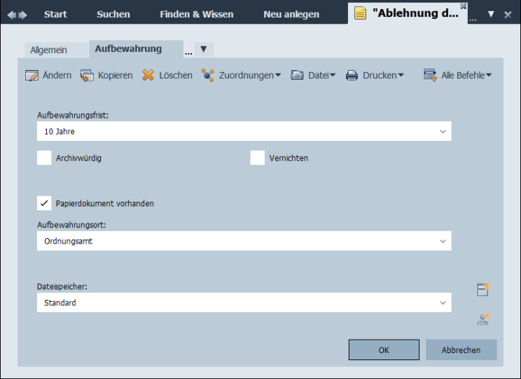 Schriftstück-Datensatz bearbeiten - Reiter "Aufbewahrung"