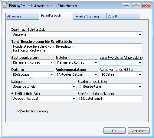 | Volltextindizierung | Legt fest, ob auf diese Weise abgelegte Schriftstücke für die Volltext-Recherche zur Verfügung stehen sollen. | Auswahl durch Markierung |
