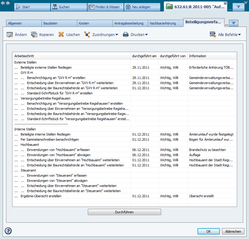 Der Detailreiter Beteiligungsverfahren der Bauakte unterstützt die Information bzw. Beteiligung der vom Bauantrag betroffenen internen und externen Stellen.