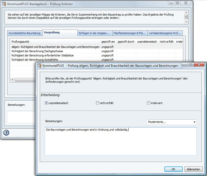 Die Dialogfenster Prüfung Unterlagen bzw. Prüfung Kriterien ermöglichen die Erfassung von Angaben zu Unterlagen und rechtlichen Vorgaben, die für ein Bauvorhaben relevant sein können.