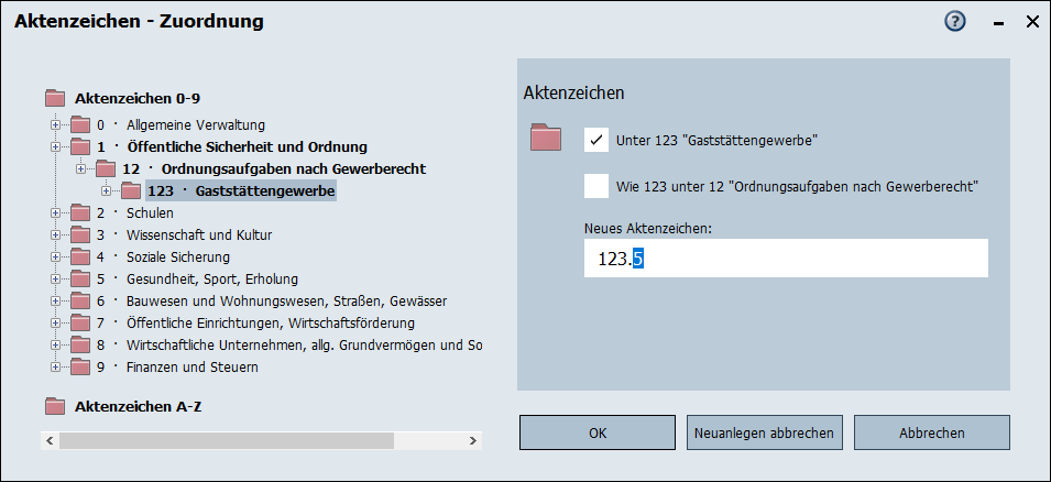 Beim Neuanlegen von Aktenzeichen wird in dem Eingabefeld Neues Aktenzeichen ein Vorschlag für das neue Aktenzeichen angeboten, beispielsweise die nächste freie fortlaufende Nummer an der entsprechenden Stelle; ist kein solcher Vorschlag möglich, wird die letzte Ebene mit Fragezeichen dargestellt und muss manuell festgelegt werden.