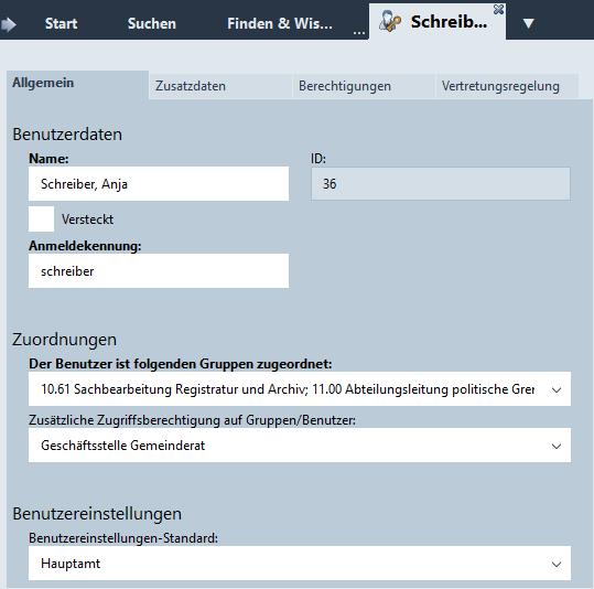 Anja Schreiber verwendet die Anmeldekennung schreiber und ist intern unter der ID 36 gespeichert. Sie ist mehreren Gruppen zugeordnet. Dadurch erbt sie alle Berechtigungen, die für diese Gruppen festgelegt sind.