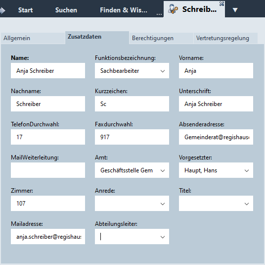 Für Anja Schreiber sind verschiedene Zusatzdaten festgelegt. Diese wirken sich z.B. auf regisafe-Module (wie Mail/Wiedervorlage) oder auf die Übergabe von Daten an Dokumente aus.