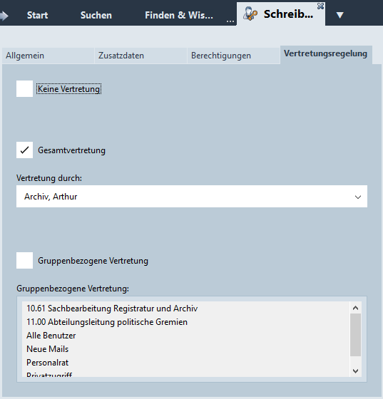 Der Benutzer kann in allen Bereichen von den angegebenen Benutzern vertreten werden.