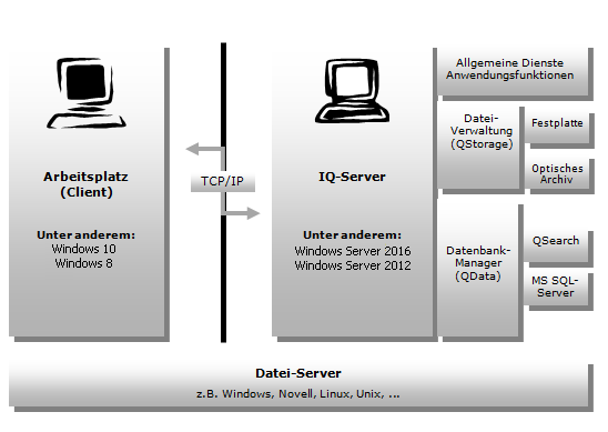 Die IQ-Technologie ist strikt nach dem Client-Server-Prinzip aufgebaut. Client und Server teilen sich die interne Ausführung von Arbeitsschritten, indem Server-Dienste zentral allen Clients (regisafe-Arbeitsplätzen) bereitgestellt werden. Der Anwender arbeitet ausschließlich mit dem Client und muss sich über diese interne Teilung keine Gedanken machen.