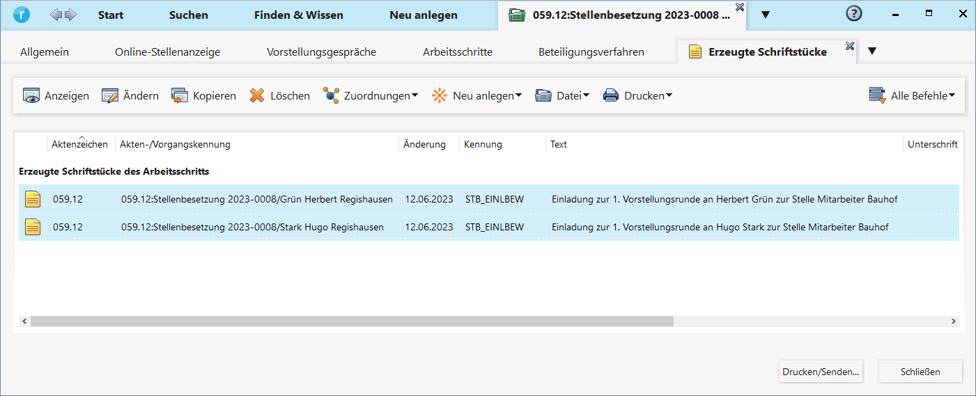 - Die erzeugten Schriftstücke werden angezeigt.