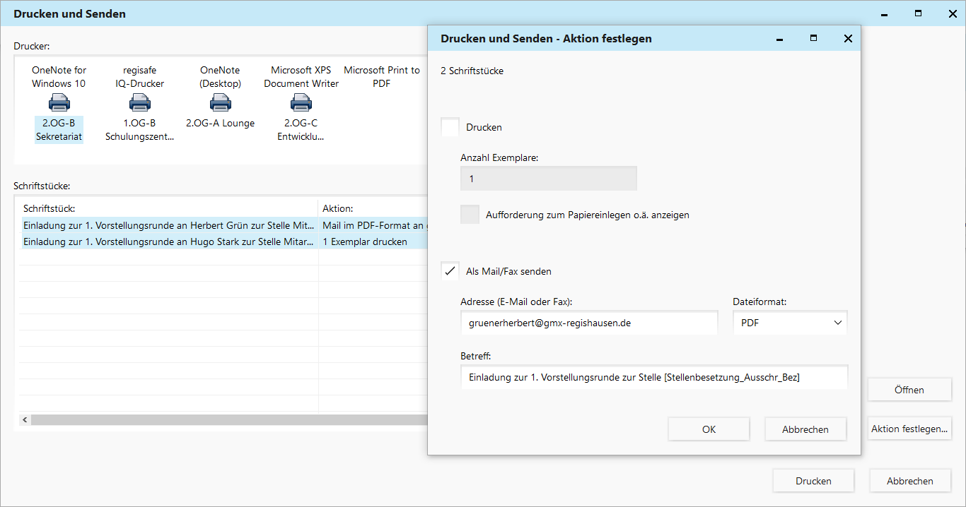 - Die Schriftstücke werden je nach vorgesehener Aktion gedruckt oder per E-Mail/Fax versendet.