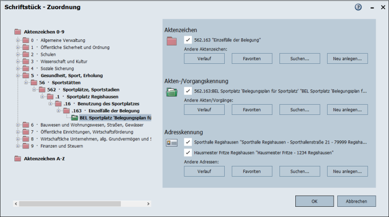 Beim Neuanlegen und Ändern von Objekten, also z.B. von Akten oder Schriftstücken, können Zuordnungen übernommen bzw. geändert werden.